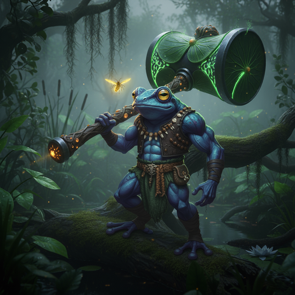 From the mist-laced wetlands of Aslyn Gulch, Lilli emerged as a fierce warrior among the grung tribes that dwell in the region’s tangled undergrowth and ancient ruins. Her bluish-purple skin, a rare hue among her kind, marked her from birth as someone touched by fate—or perhaps something darker.